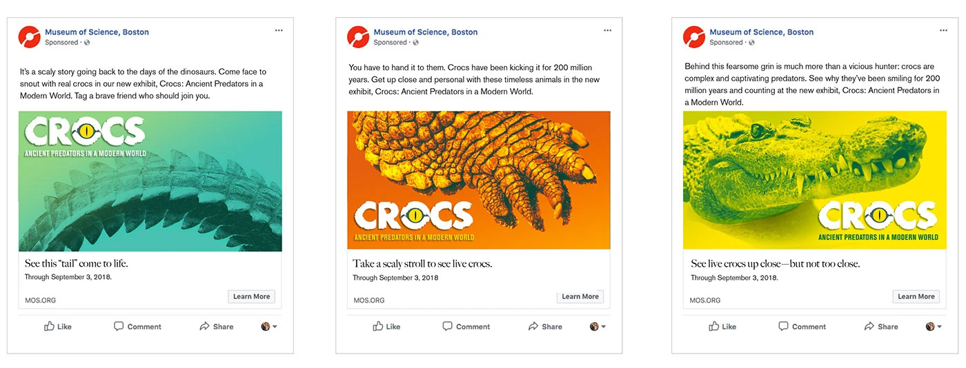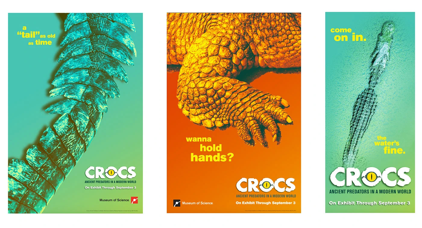 It’s a unique challenge to marry existing exhibit branding with a marketing approach that screams “summer family fun” and “crodilians” in equal measure. This approach capitalizes on elements from the Museum parent brand including bold use of color and gradients, macro/micro perspectives, and smart fun copy that highlight crocs while allowing the viewer to see them in a whole new way.