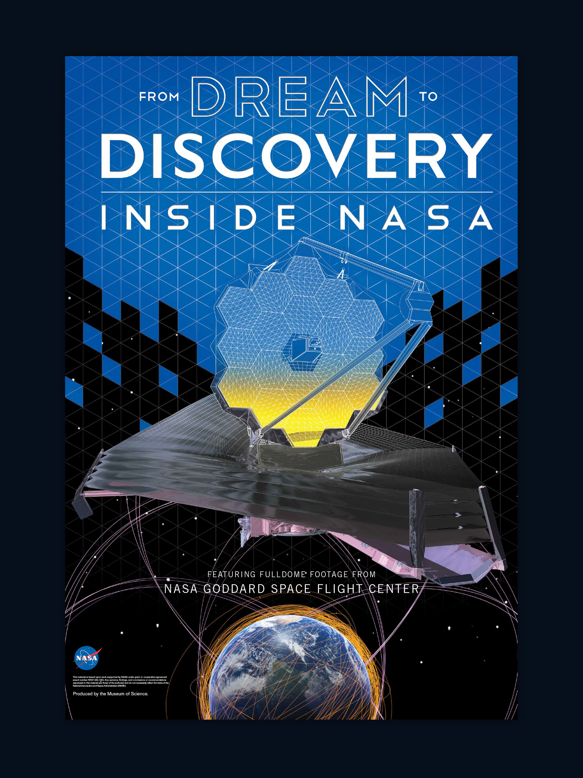 Inspired by the spirit of innovation captured within this planetarium show, it was important to me to connote the representation of and relationship with NASA within the key art, done by including key elements from their brand both past and present. This show allows the viewer to experience NASA engineering from blueprint to blast off and I wanted that process to be clearly felt even in a still image.