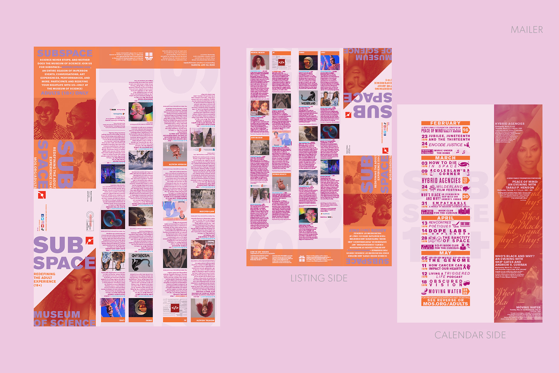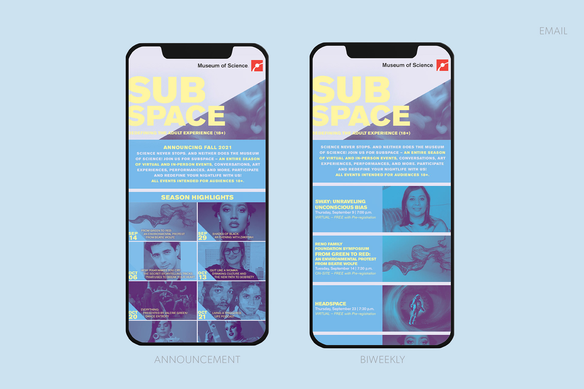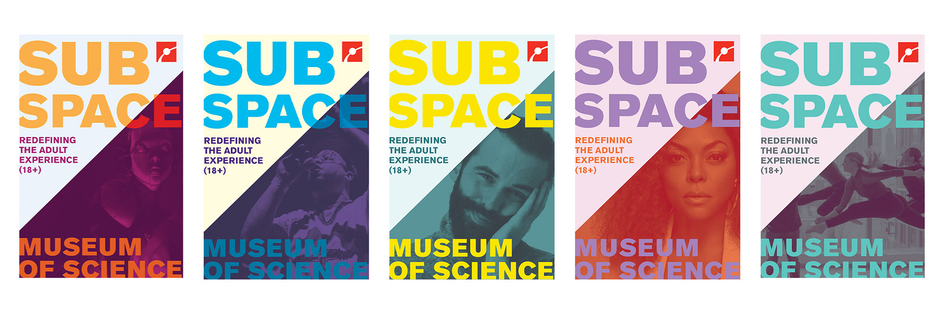 SubSpace is the master brand for Adult Programs at the Museum of Science. Since launch, it has not only grown to be an award winning content arena but also one of the most comprehensive brand lines at the Museum. From the innovative direct mailer that doubles as an art rich calendar, to digital marketing, to day of materials be they physical or virtual, the audience has a lossless experience which echoes the programming itself; bold, dynamic, unexpected. I often talk about SubSpace pushing the boundaries of the Museum’s core brand to its reaches but by design. It has to so it can compete in external markets but also so that it can stand apart from the Museum’s non adult programming. While overall styling and vibe are retained, each season carries its own color palette which is carried across all marketing in some manner to do just that. dynamic, unexpected. I often talk about SubSpace pushing the boundaries of the Museum’s core brand to its reaches but by design. It has to so it can compete in external markets but also so that it can stand apart from the Museum’s non adult programming. While overall styling and vibe are retained, each season carries its own color palette which is carried across all marketing in some manner to do just that.