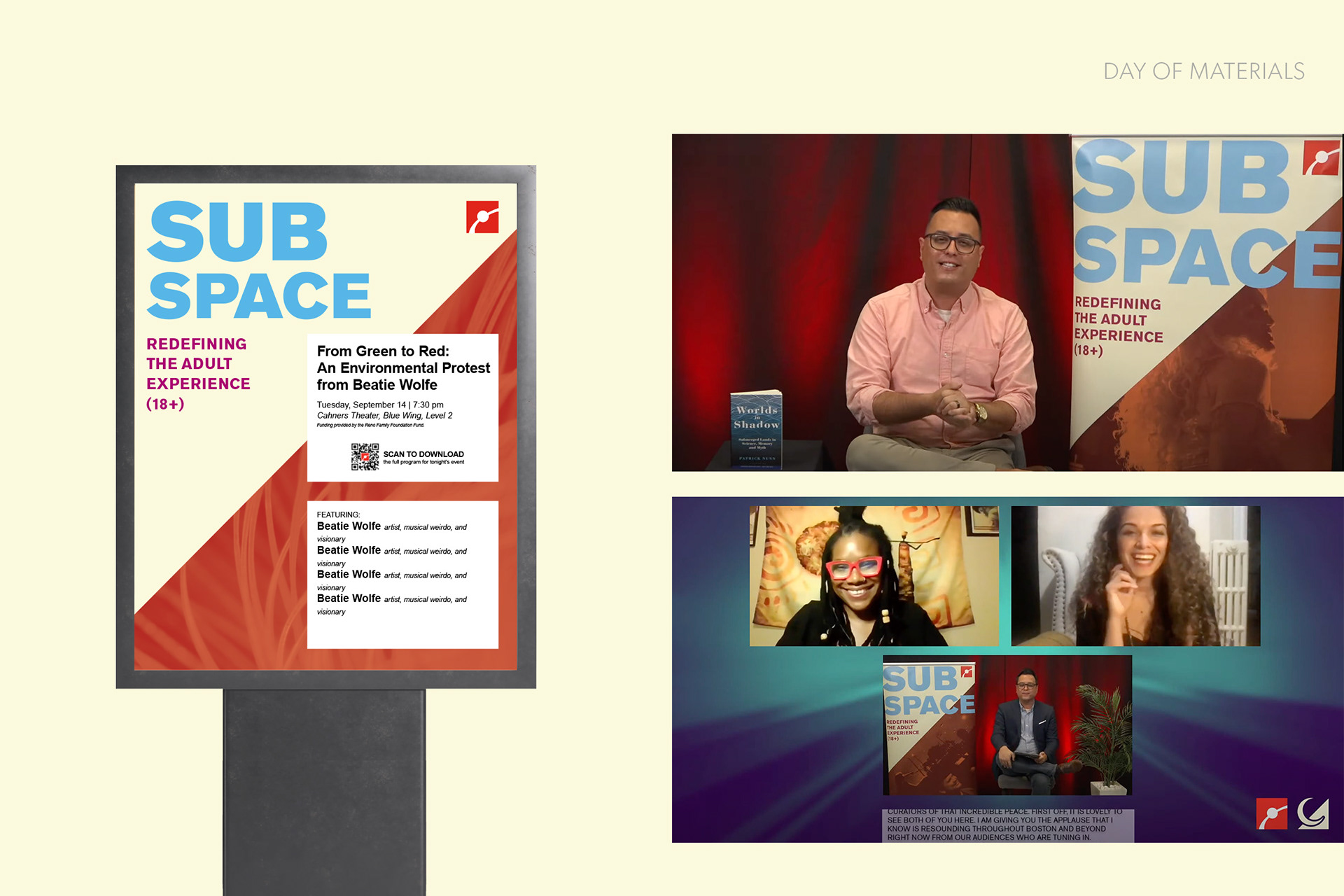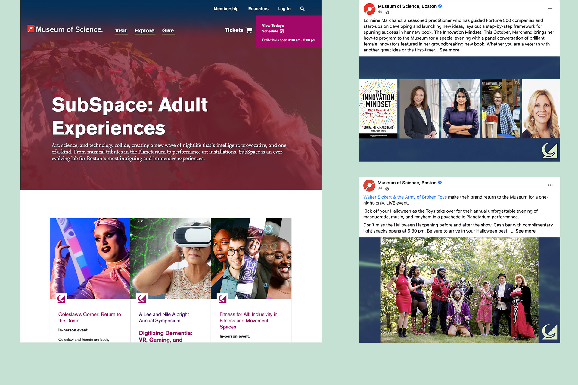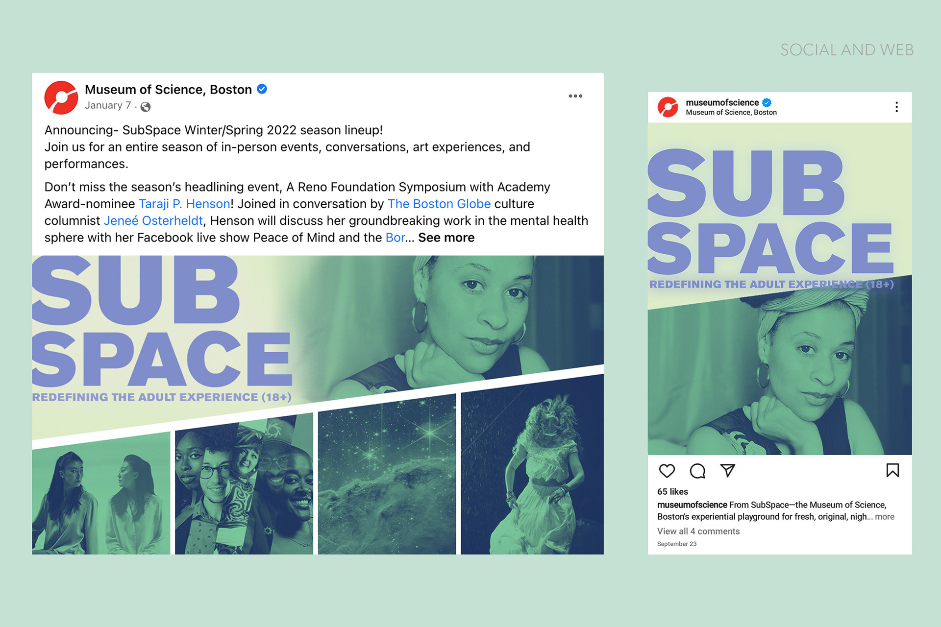 SubSpace is the master brand for Adult Programs at the Museum of Science. Since launch, it has not only grown to be an award winning content arena but also one of the most comprehensive brand lines at the Museum. From the innovative direct mailer that doubles as an art rich calendar, to digital marketing, to day of materials be they physical or virtual, the audience has a lossless experience which echoes the programming itself; bold, dynamic, unexpected. I often talk about SubSpace pushing the boundaries of the Museum’s core brand to its reaches but by design. It has to so it can compete in external markets but also so that it can stand apart from the Museum’s non adult programming. While overall styling and vibe are retained, each season carries its own color palette which is carried across all marketing in some manner to do just that. dynamic, unexpected. I often talk about SubSpace pushing the boundaries of the Museum’s core brand to its reaches but by design. It has to so it can compete in external markets but also so that it can stand apart from the Museum’s non adult programming. While overall styling and vibe are retained, each season carries its own color palette which is carried across all marketing in some manner to do just that.