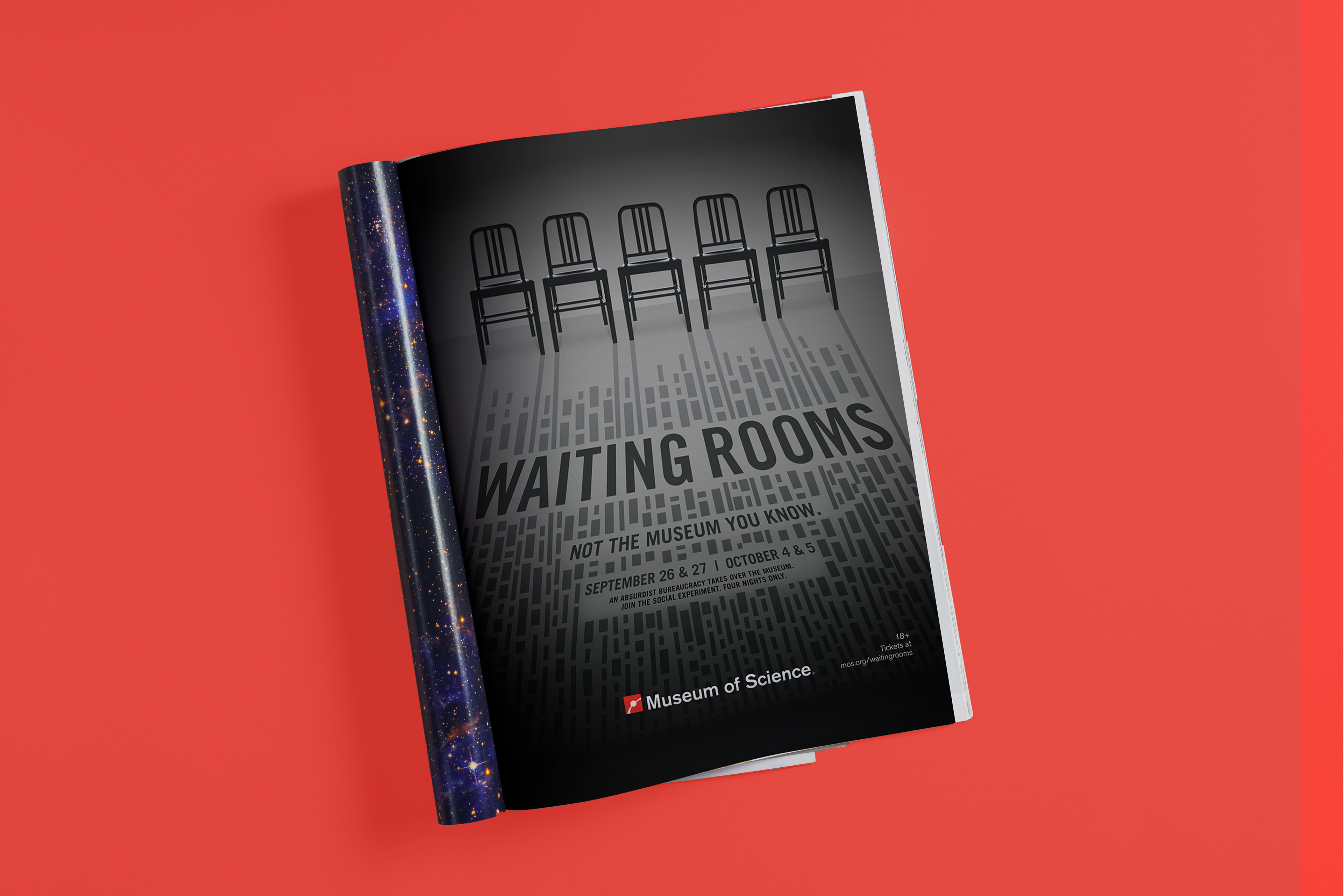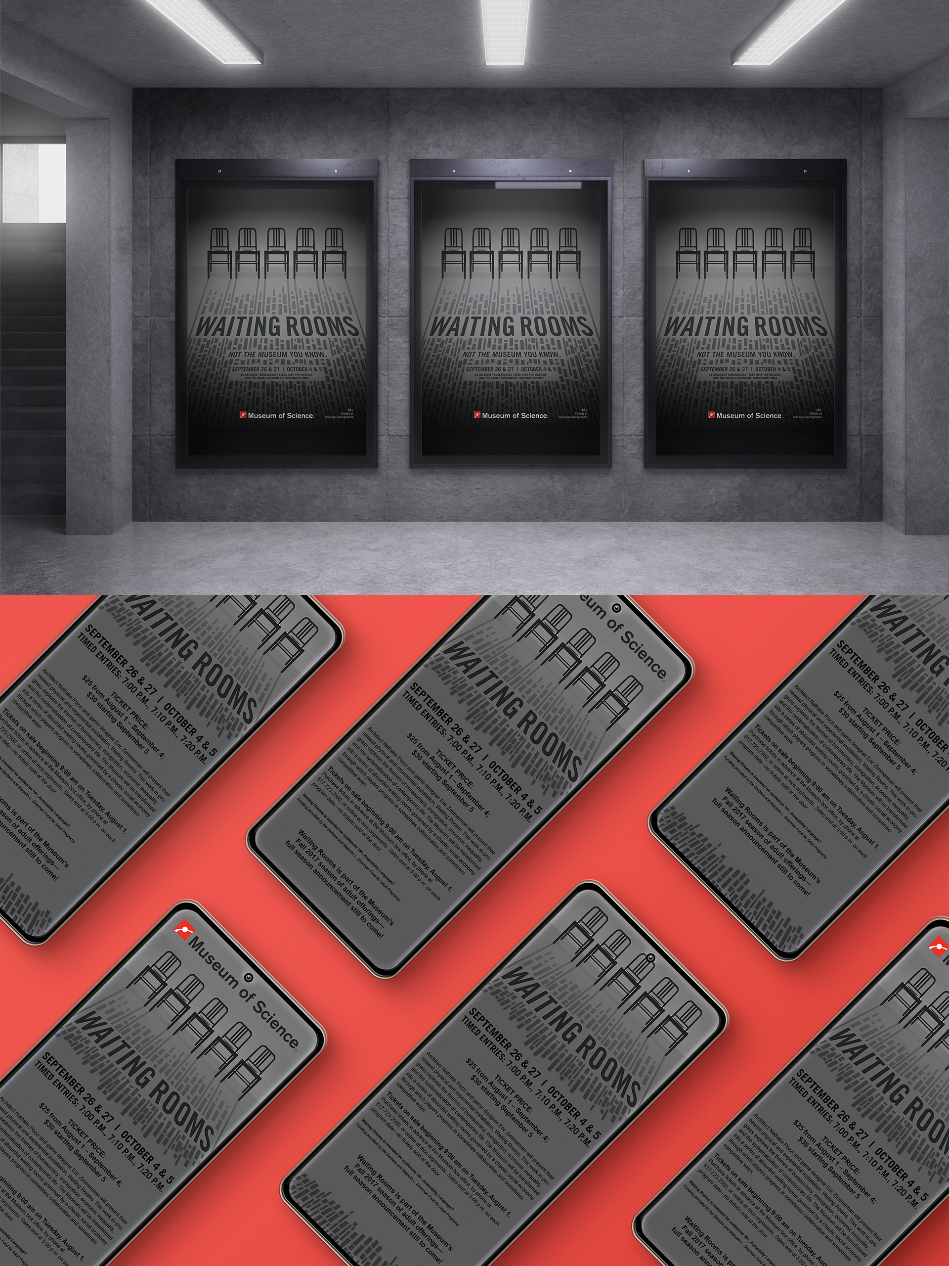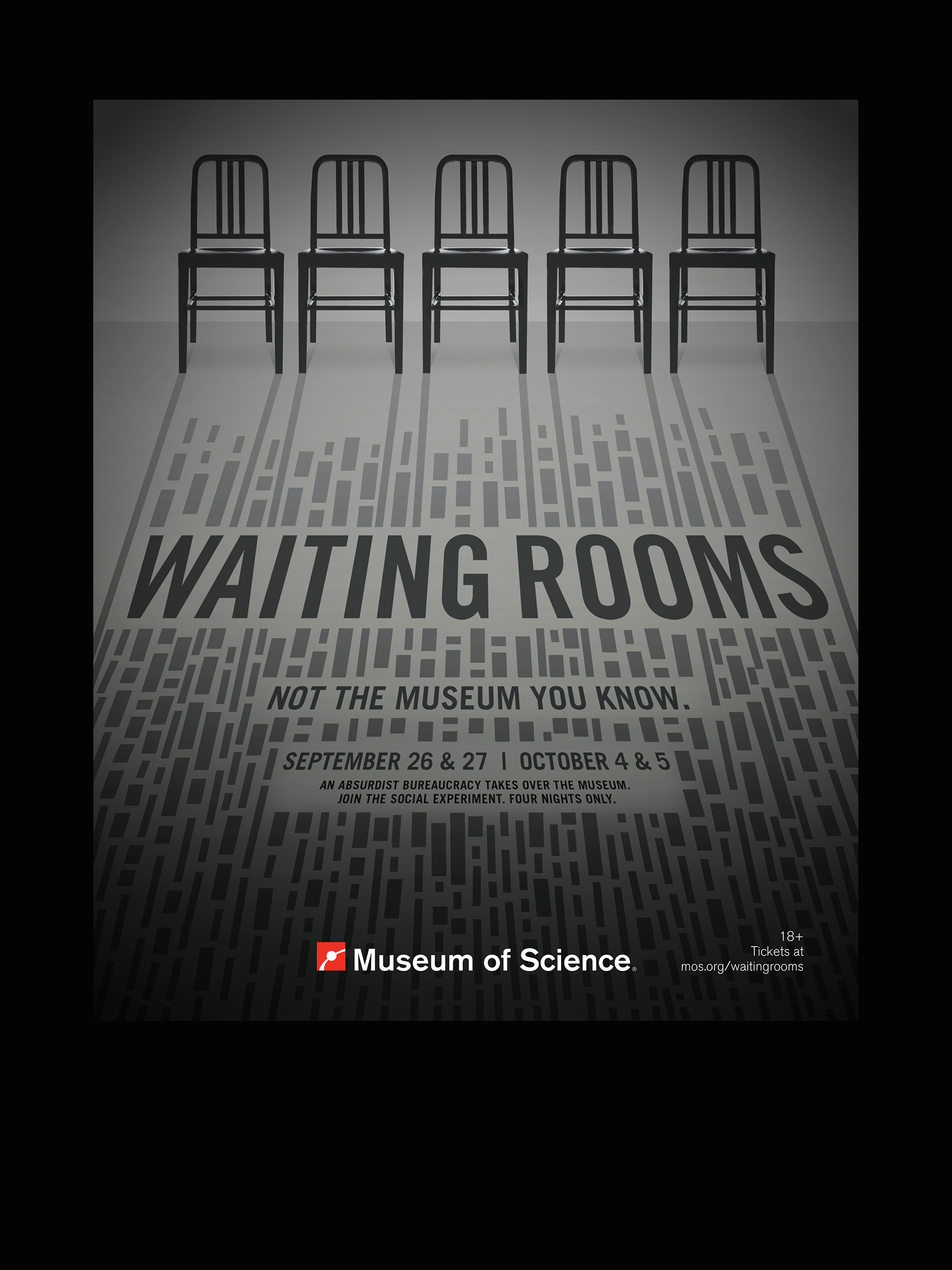 What happens when a game designer and an architect have free run of a museum? A site specific installation that’s equal parts kafkaesque and social experiment. Echoing the twists, turns, dead ends, and of course, waiting that comprised this experience’s invented bureaucracy, this ad/key art illustrates a labyrinth that blends from shadows to rooms to pathways and back again.